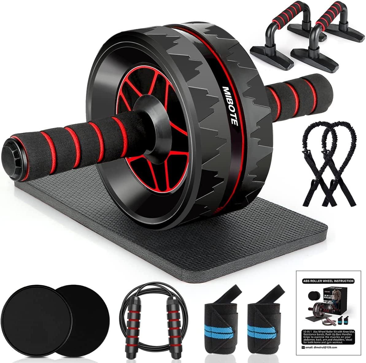 - 13-in-1 Abs Roller Wheel Set - Come with all the accessories you need. Includes 1x ABs roller wheel, 1x thick knee pad, 1x jump rope, 2x resistance bands, 2x push-up bars, 2x core sliders, 2x wrist wraps, 1x guide book and 1x gift box. Gym-grade all-inclusive fitness equipment suitable for beginners and advanced exercisers.